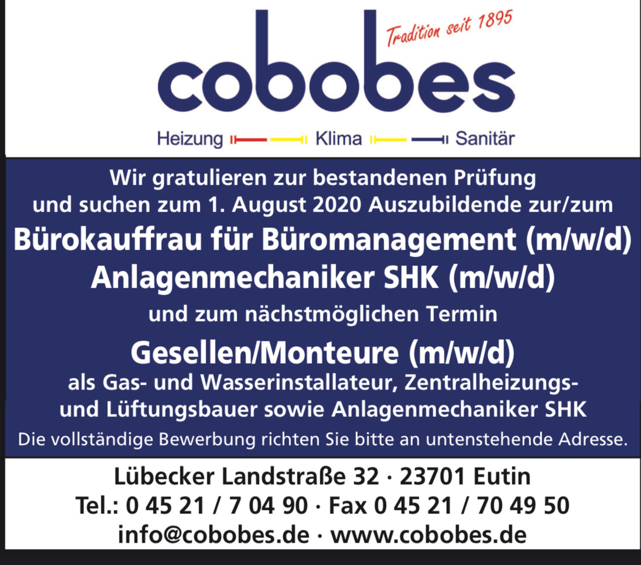 Wir freuen uns auf Deine Bewerbung für eine Ausbildung auf dem Postweg oder per E-Mail stefan.dose@cobobes.de