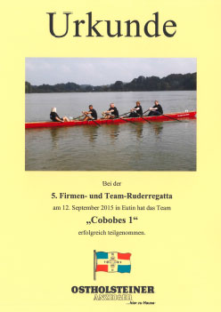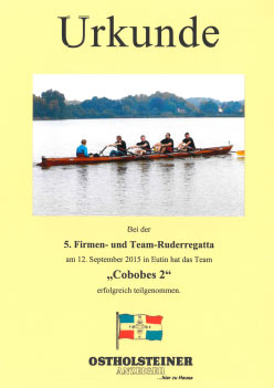 Die Firma Cobobes aus Eutin hat bei der 5. Firmen- und Vereinsteam-Regatta des Germania Rudervereins Eutin (GRVE) am 12. September 2015 mit zwei Teams, einem Büro- und einem Monteurteam, teilgenommen. Die Regatta wird in Breitensport-Vierern mit einem Steuermann vom Ruderverein über eine Strecke von 500 Metern gefahren. Vorab fanden für beide Teams vier Trainings beim Germania Ruderverein mit jeweils einem Paten des Vereines statt. Dabei steht der Teamgeist und der Spaß im Vordergrund.