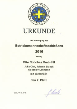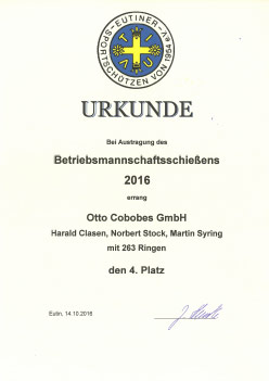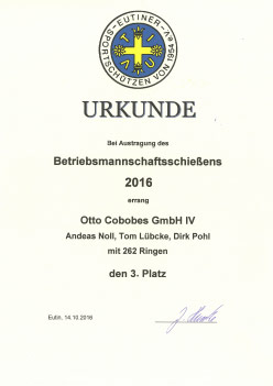 Die Firma Cobobes hat mit 4 Teams zu je 3 Personen an der 58. Auflage des Betriebsmannschaftsschießen der Eutiner Sportschützen teilgenommen. Nach vier Trainingseinheiten und dem Wettkampf am 12.10.2016 wurden die Plätze 1 – 4 in 2 Mannschaftsklassen belegt. Dabei erreichte das Cobobes Team II bestehend aus Norbert Benner, Michael Heinze und Marcus Kiefer mit 263 Ringen den 1. Platz. Auf Platz 2 folgte das Cobobes Team III bestehend aus Julia Ohlf, Johann Blunck und Vjaceslav Lehmann mit 262 Ringen. Den dritten Platz belegte das Cobobes Team IV bestehend aus Andreas Noll, Tom Lübcke und Dirk Pohl. Den vierten Platz belegte Cobobes Team I bestehend aus Harald Clasen, Norbert Stock und Martin Syring. Die Firme Cobobes bedankt sich bei den Eutiner Sportschützen für die gelungene Veranstaltung und freut sich, dass solche Veranstaltungen zur Stärkung des Teamgeistes durchgeführt werden