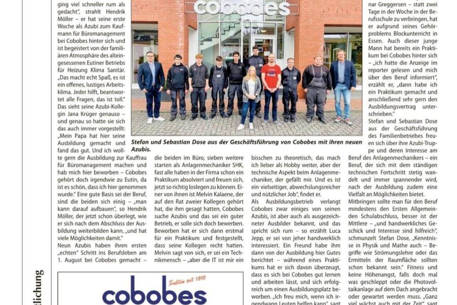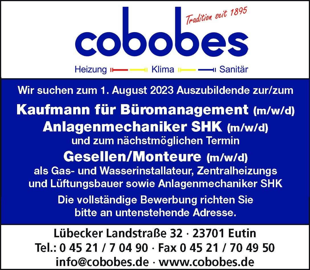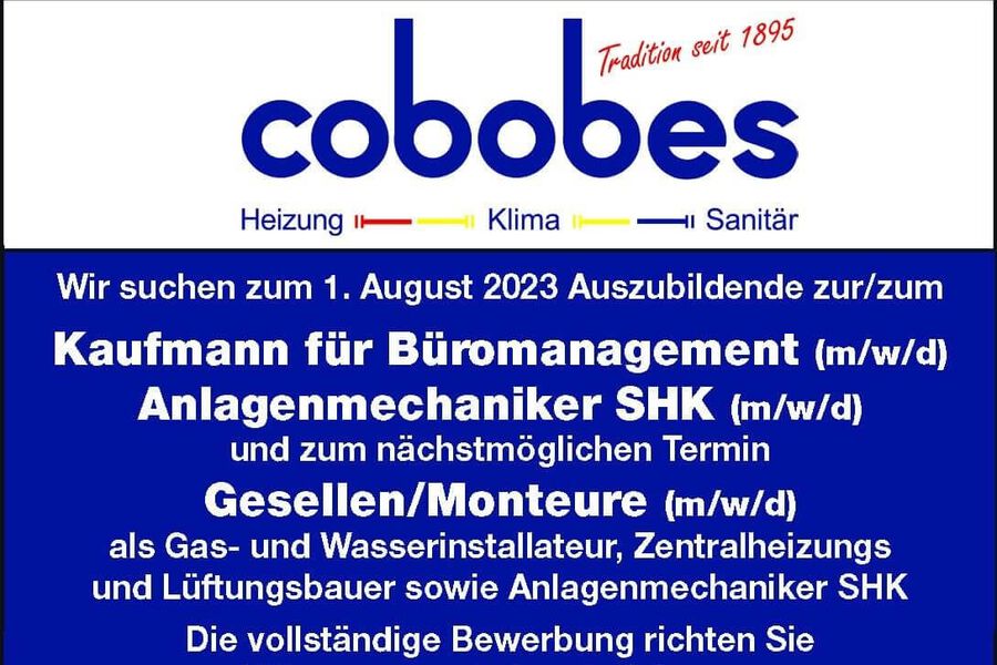 Habt Ihr auch Interesse an einer Ausbildung oder Pratikum zum Kennenlernen, dann gerne ab sofort für 2023 bewerben unter www.cobobes.de/bewerbungsformular.html