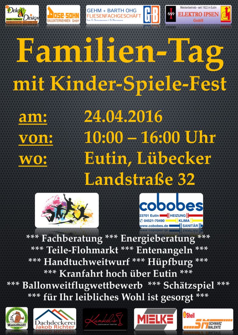 Am 24.04.2016 findet das Familienfest „Eutin Erleben“ in der Industriestraße und Lübecker Landstraße in Eutin statt.
