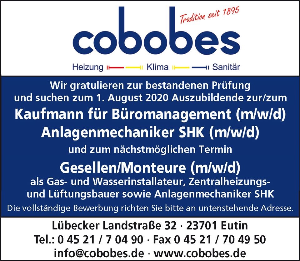 Wir freuen uns auf Deine Bewerbung für eine Ausbildung oder gewerbliches Praktika auf dem Postweg oder per E-Mail: stefan.dose@cobobes.de