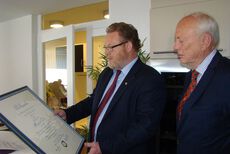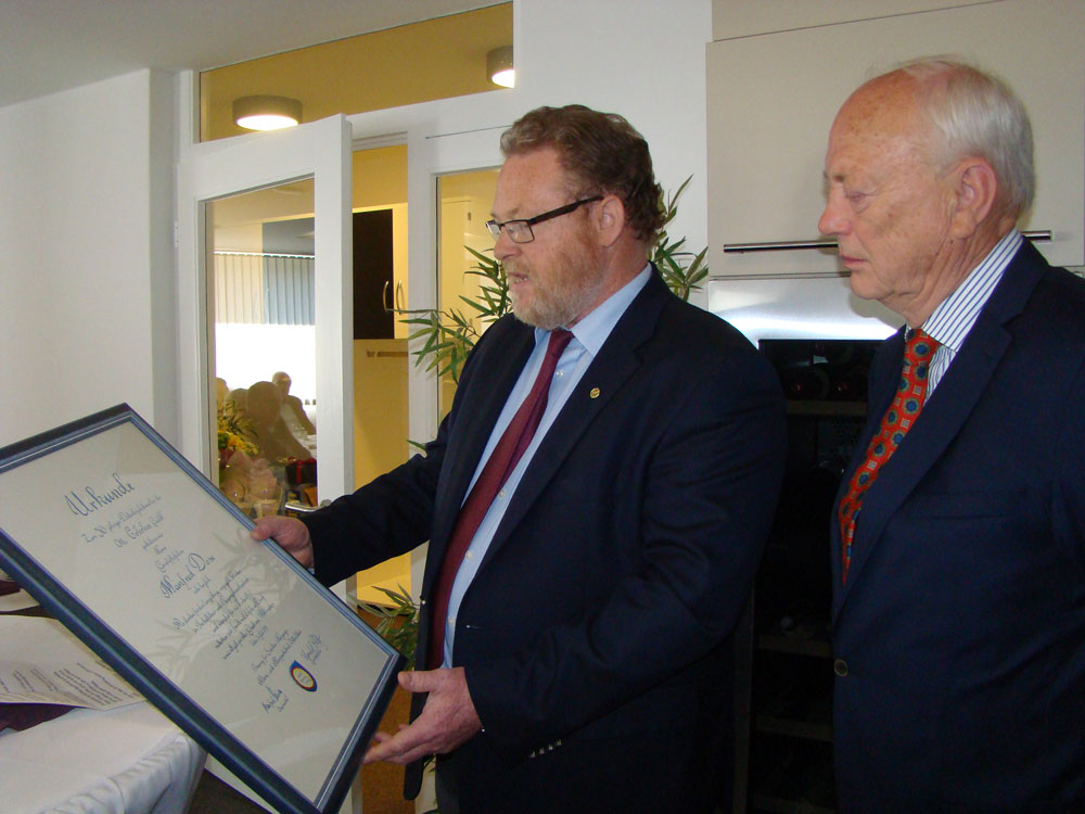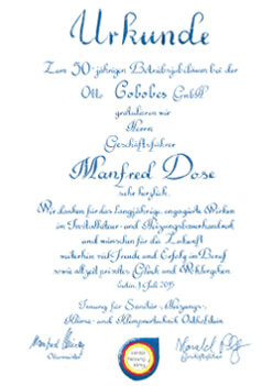 Es folgte als nächster Redner der Obermeister der Innung Ostholstein und Betriebsleiter der Otto Cobobes GmbH Manfred Obieray. Er bewundere das technische Wissen von Herrn Manfred Dose, der in seiner Bescheidenheit oft von sich selbst sagt, „ich bin ja nur Kaufmann“ und im gleichen Atemzug einen Lösungsweg bei Problemstellungen präsentiert. „Lieber Herr Dose, Sie sind nicht nur Kaufmann, sondern unser aller Vorbild“, so Manfred Obieray weiter. Daraufhin überreichte er eine handgeschriebene Urkunde als Erinnerung an den besonderen Tag.