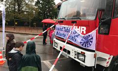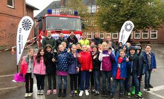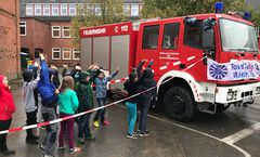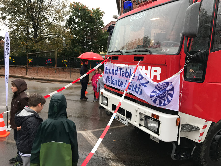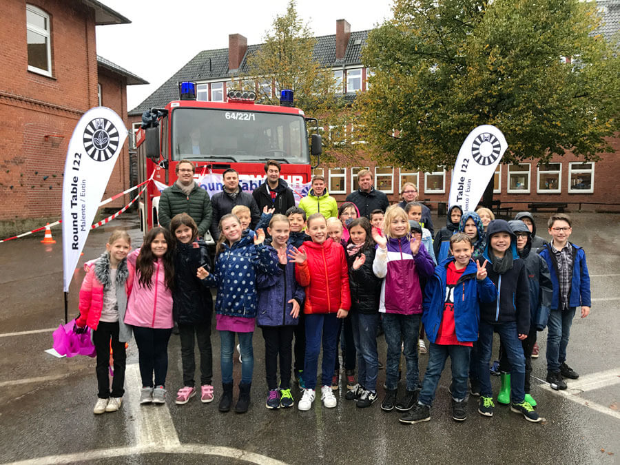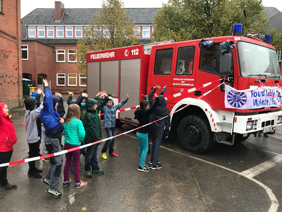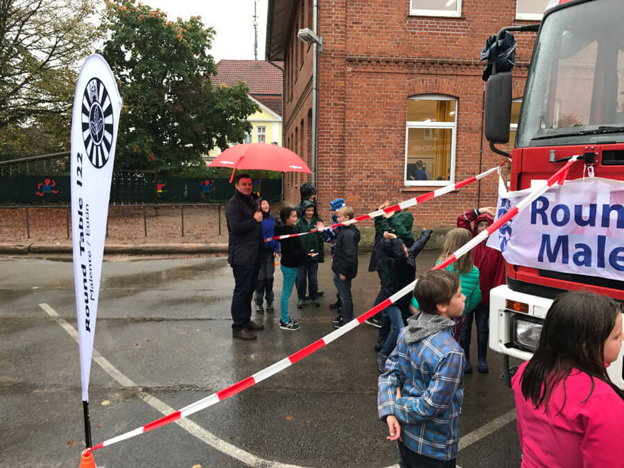 Im Anschluss greifen wir vom Round Table Eutin - Malente aktiv in das Geschehen ein. Mit einem Feuerwehrauto auf dem Schulhof, Absperrband, um den "Toten Winkel" darzustellen, zeigen wir den Kindern, die nacheinander im Führerhaus des Feuerwehrautos Platz nehmen dürfen, wie ihre Klassenkameraden im "Toten Winkel" verschwinden. In einer zweiten Übung nähern sich die Kinder langsam von vorne an das Feuerwehrauto an. An einem bestimmten Punkt werden die Kinder, aus der Sicht des Führerhauses des Feuerwehrauto verschwinden.
