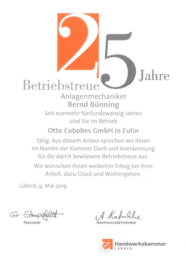 Vergangene Woche feierte Bernd Bünning aus Neukirchen sein 25 jähriges Jubiläum. Aus diesem Anlass wurden der Jubilar mit einer Urkunde der Handwerkskammer Lübeck ausgezeichnet.