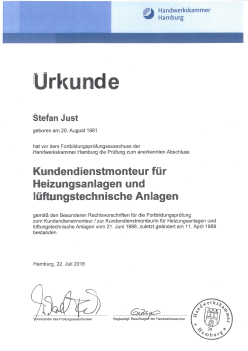 Wir gratulieren Herrn Just zu seinem sehr guten Abschluss zum Kundendienstmonteur für Heizungsanlagen und lüftungstechnische Anlagen.