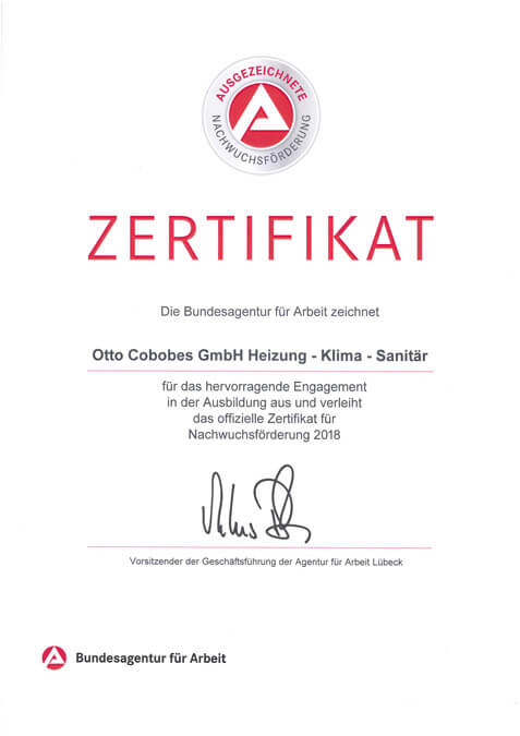 Zu den Unternehmenszielen gehört die Verantwortung gegenüber heranwachsenden Generationen. Unsere Auszubildenden erhalten bei uns z.B. „eine besondere Ausbildungsleistung“ – bestätigt durch die Handwerkskammer und die Bundesagentur für Arbeit Lübeck – in der aufstrebenden Branche der Gebäude- und Energietechnik.