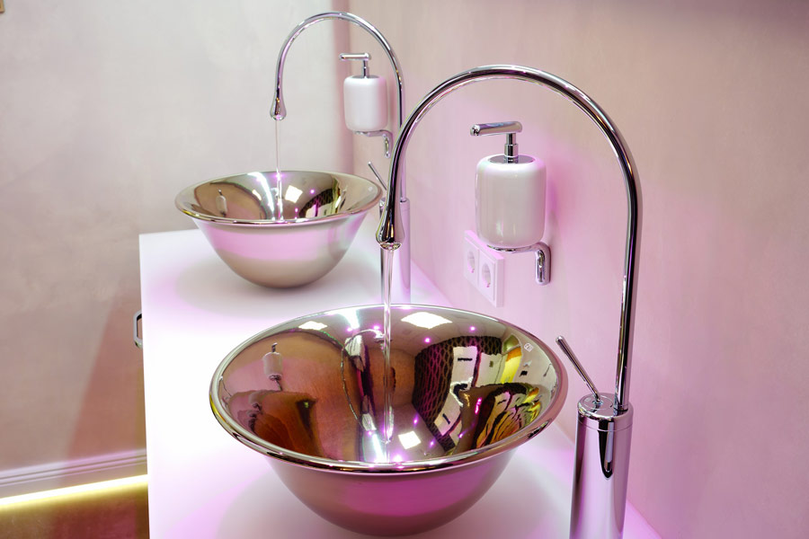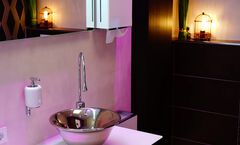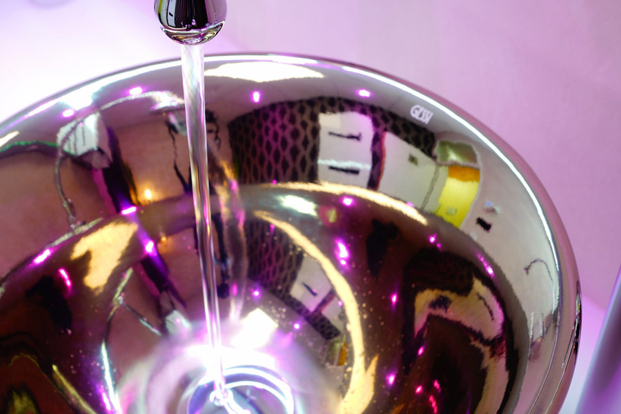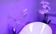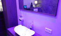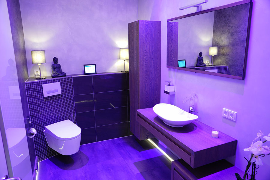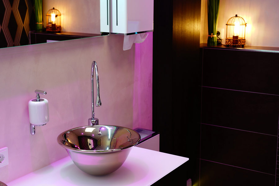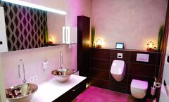 Die Highlights in den beiden Bädern sind die Echtholzmöbel von Floor und Furniture, aber auch die verschromten Gessi Aufsatzwaschbecken aus Keramik, die neue Hansgrohe Armatur mit Glasauslauf mit Tornado Wasserwirbel oder das Geberit-Dusch-WC, welches mit einem Wasserstrahl reinigt. Außerdem wurden die WCs mit Farbbeleuchtung und einem Unterputzradio mit Iphone-Dockingstation ausgerüstet.
