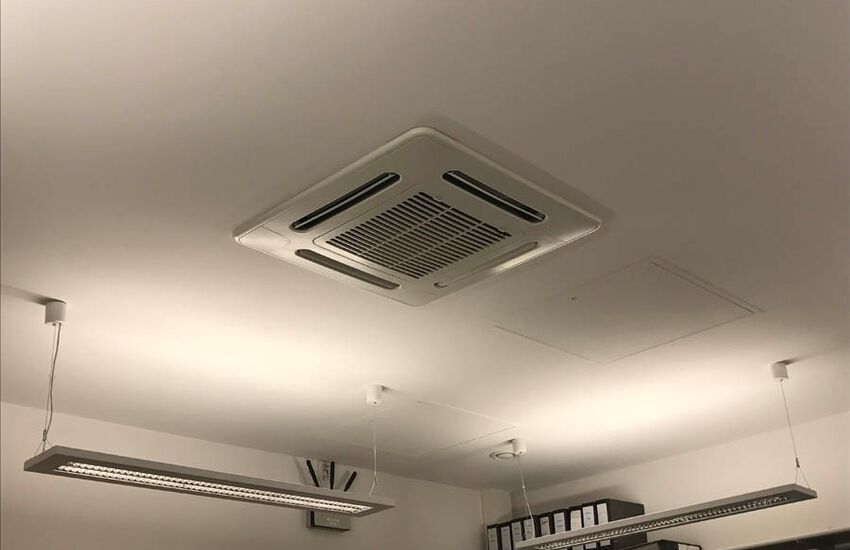 Einbau einer Klimaanlage bestehend aus drei Wandgeräten und einer Klimakassette, Kühlleistung: 14 kW