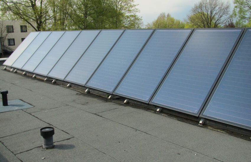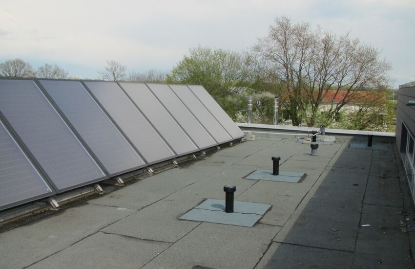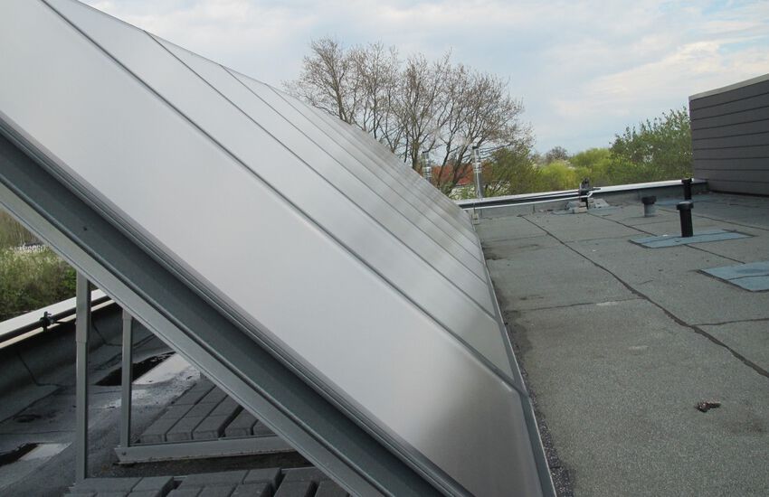 10 Flachkollektoren zur Unterstützung der Trinkwasser- und Heizungsanlage mit Pufferspeicher und Solarstation