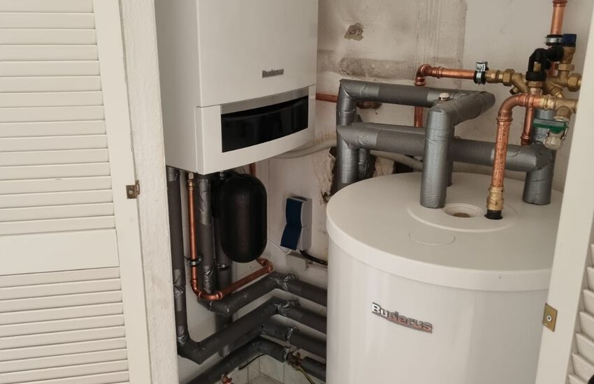 Einbau eines Gasbrennwertgerätes mit nebengestellten Warmwasserbereiter, Fabrikat: Buderus