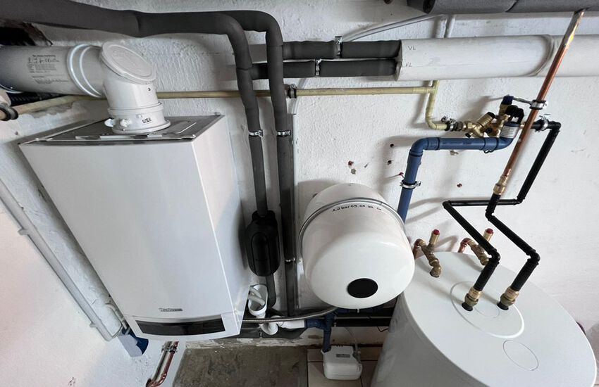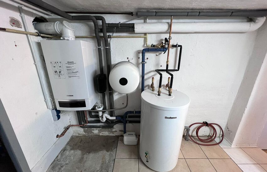Einbau einer Gasbrennwertanlage mit nebengestellten Warmwasserbereiter, Fabrikat: Buderus