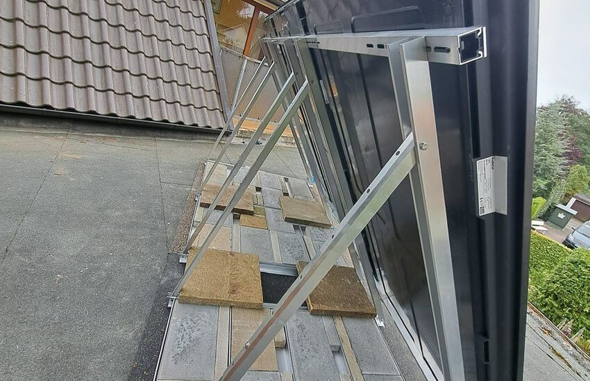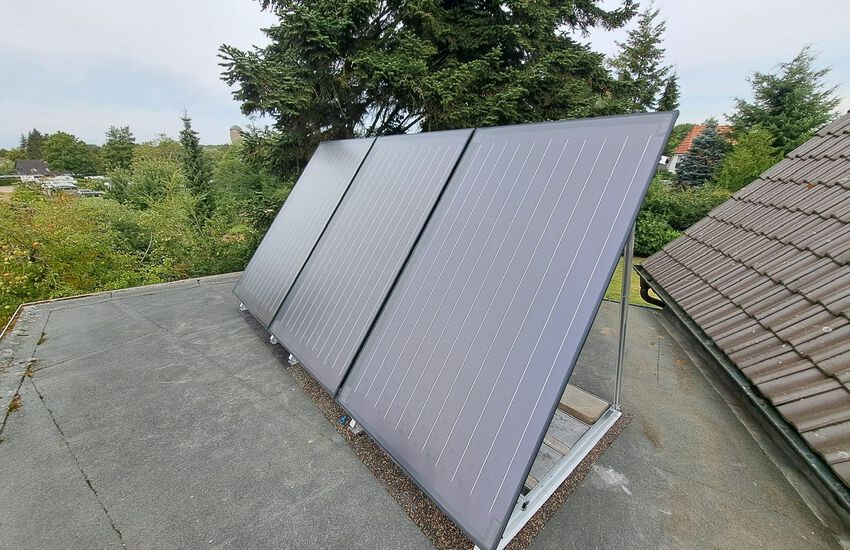 Einbau einer bodenstehenden Gasbrennwertanlage mit nebengestellten Warmwasserbereiter mit Solar für Warmwasserbereitung auf dem Flachdach, Fabrikat: Buderus