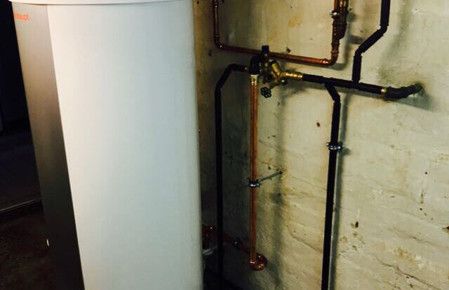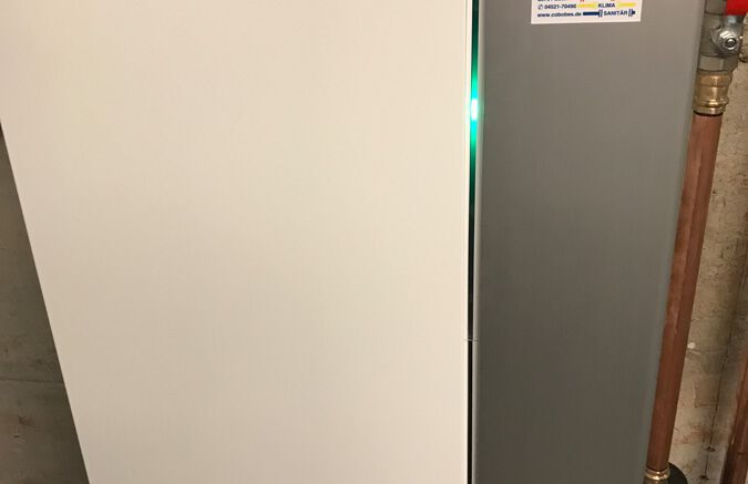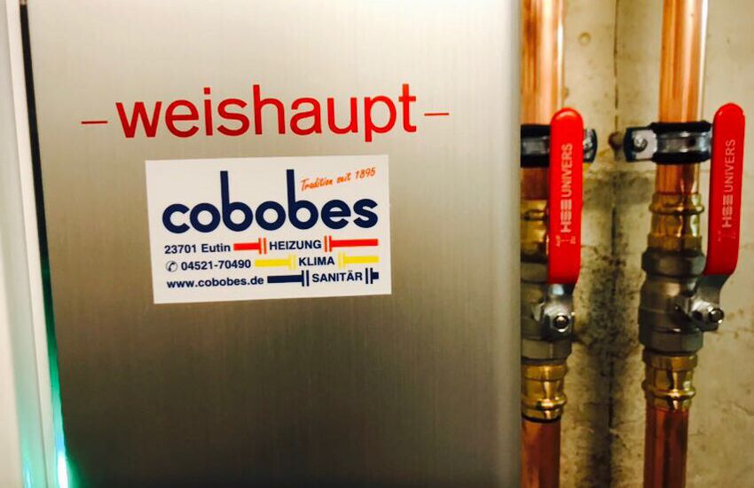 Einbau eines Gasbrennwertgerätes mit nebengestelltem Warmwasserbereiter, Fabrikat Weishaupt