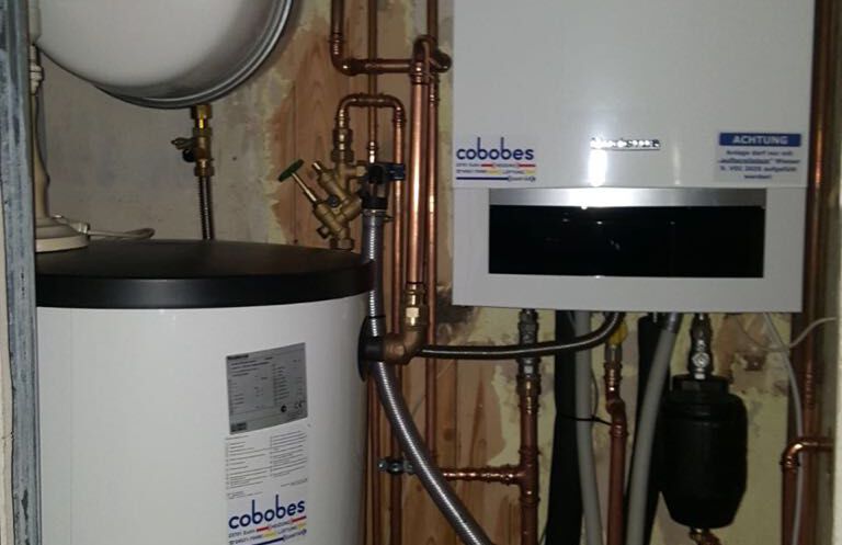 Einbau eines Gasbrennwertgerätes mit nebengestelltem Warmwasserbereiter, Fabrikat: Buderus