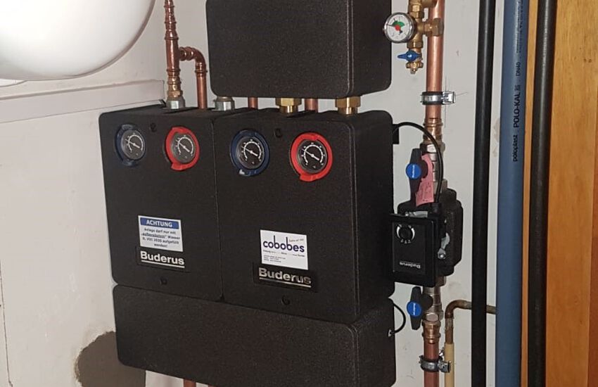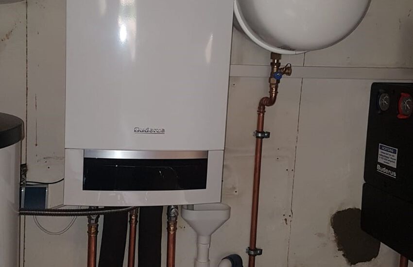 Einbau eines Gasbrennwertgerätes mit nebengestellten Warmwasserbereiter, Fabrikat: Buderus