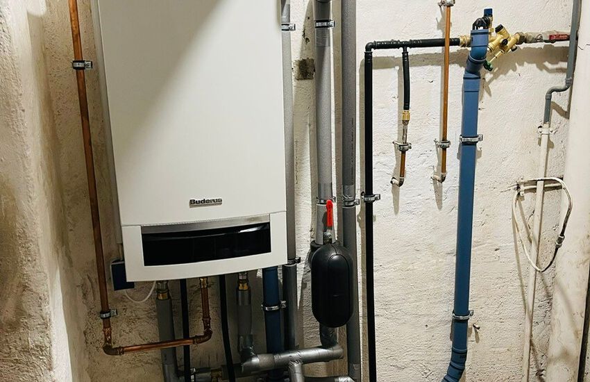 Einbau eines wandhängenden Gasbrennwertgerätes mit Warmwasser im Durchlaufprinzip, Fabrikat: Buderus