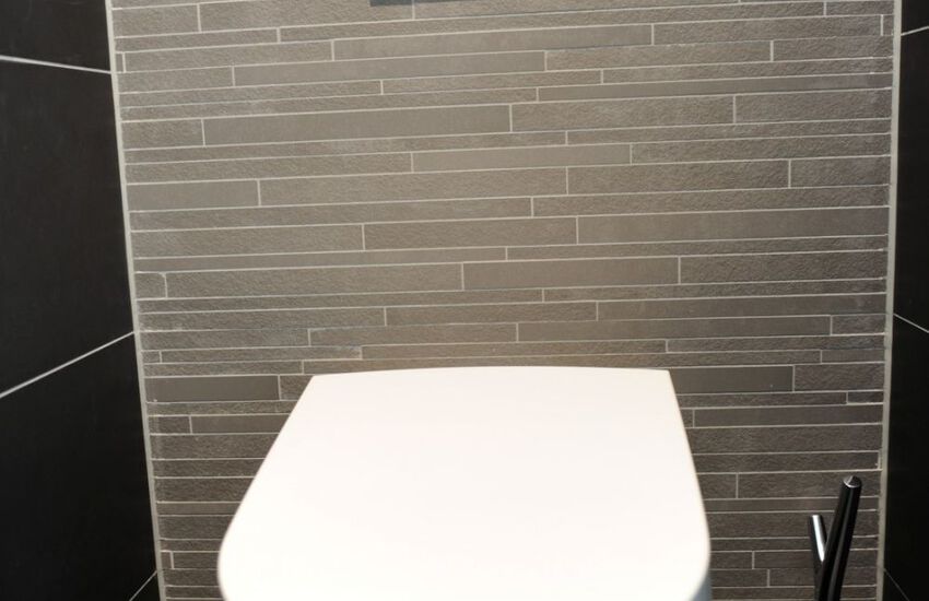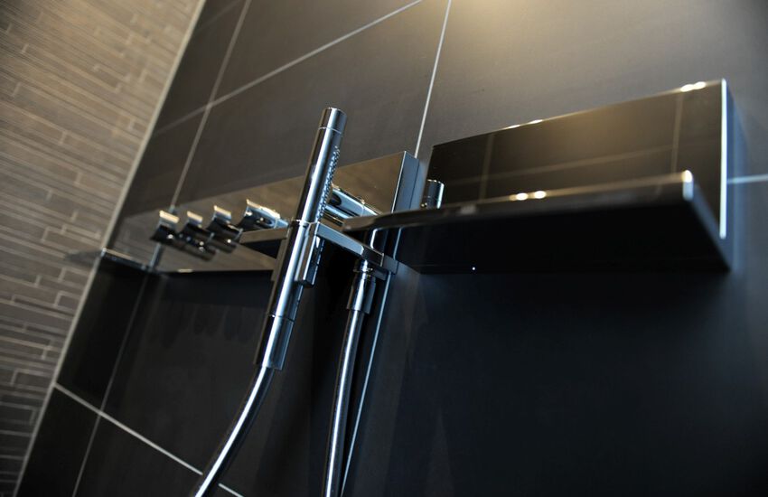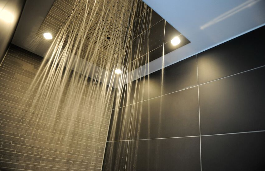 - Gemauerte Dusch mit Duschhimmel mit LED-Beleuchtung, Hansgrohe und beleuchteter Duschrinne, Aco