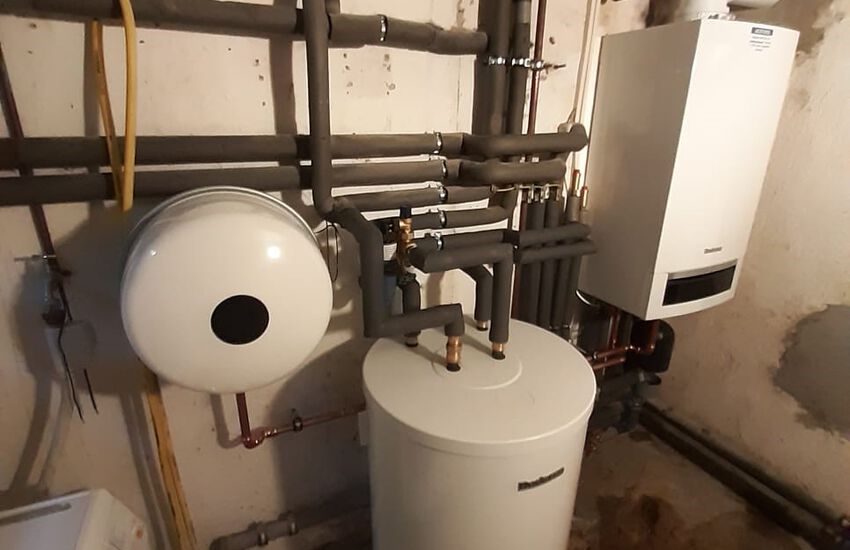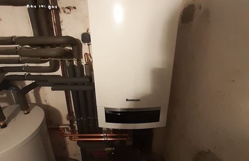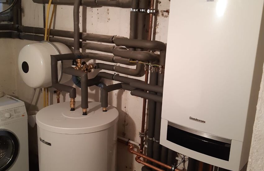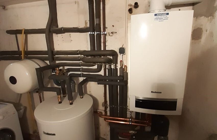 Einbau einer Gasbrennwertanlage mit nebengestellten Warmwasserbereiter, Fabrikat: Buderus