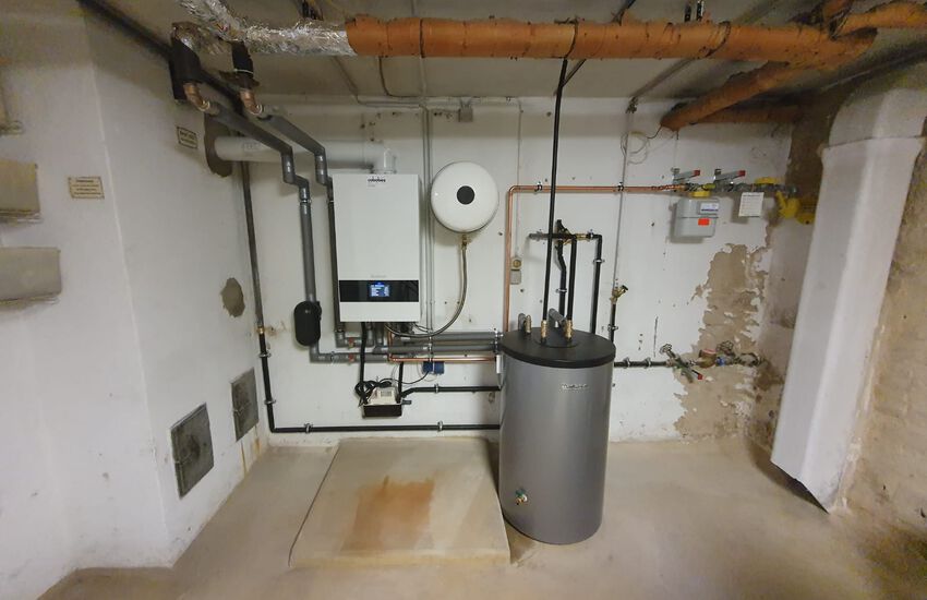 Einbau einer Gasbrennwertanlage mit nebengestellten Warmwasserbereiter, Fabrikat: Buderus