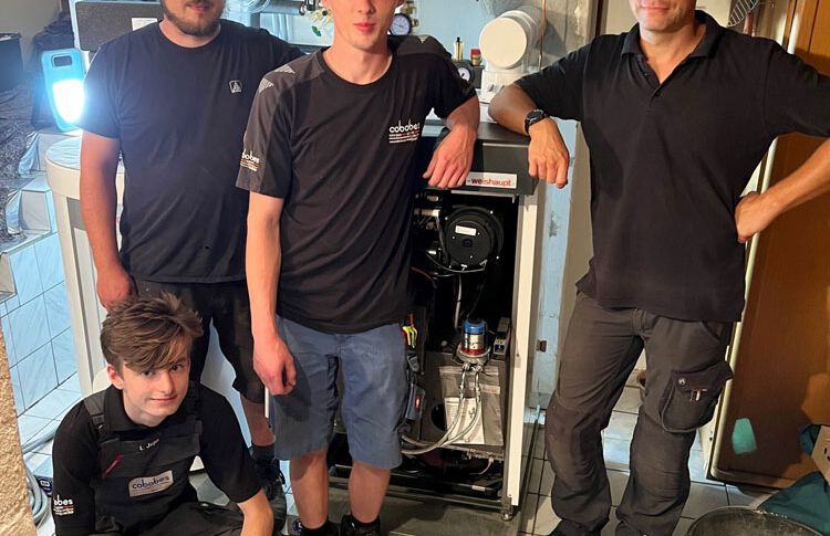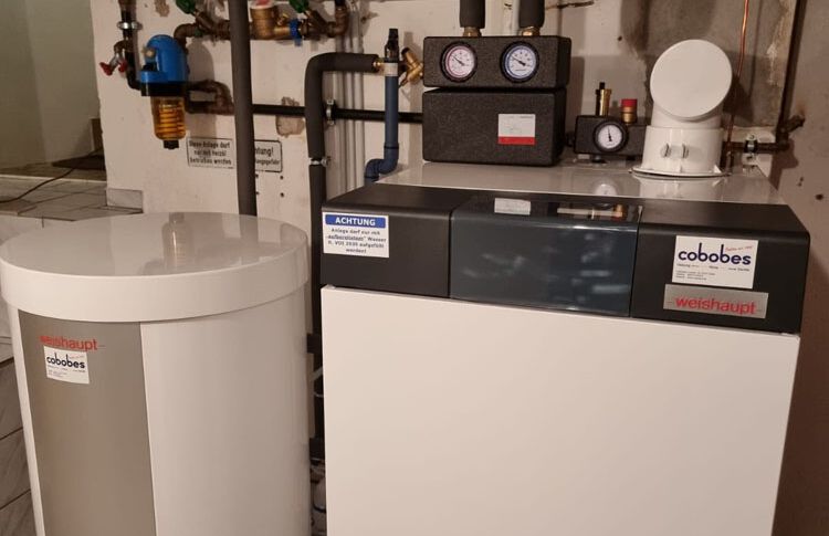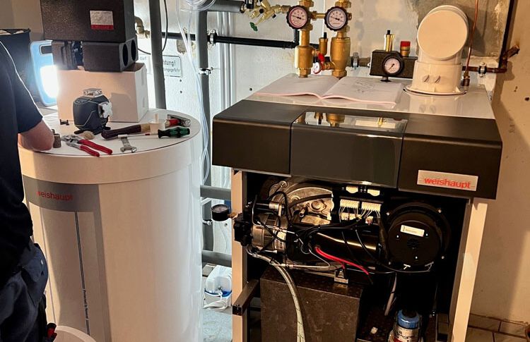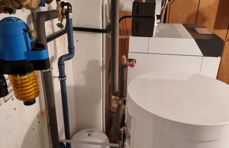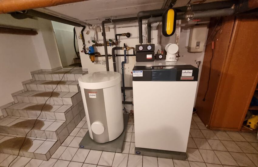Einbau einer bodenstehenden Gasbrennwertanlage mit nebengestellten Warmwasserbereiter, Fabrikat: Weishaupt