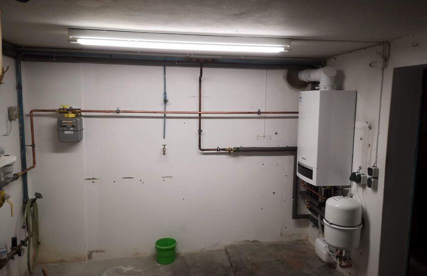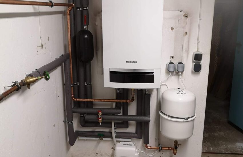 Einbau eines wandhängenden Gasbrennwertgerätes mit Warmwasser im Durchlaufprinzip, Fabrikat: Buderus