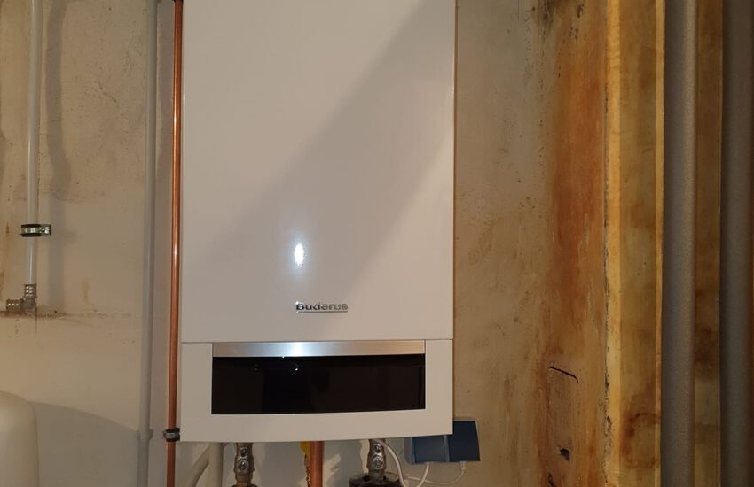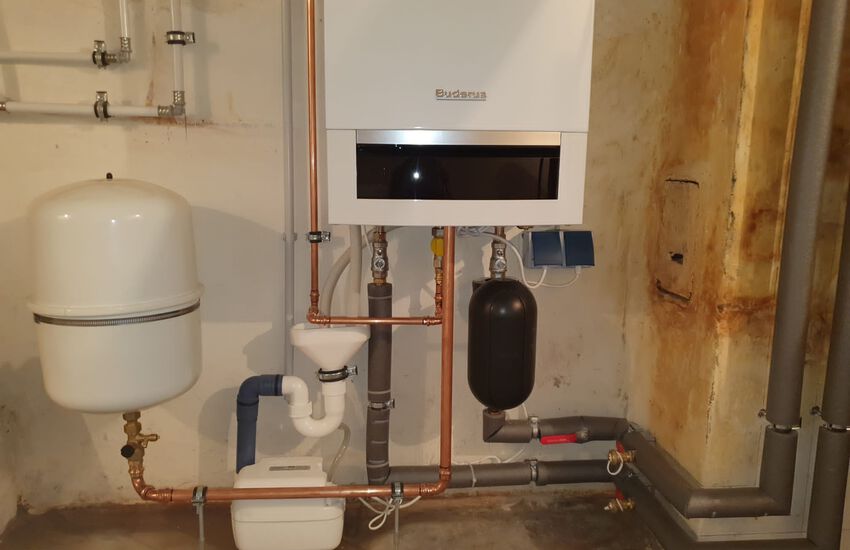 Einbau eines wandhängenden Gasbrennwertgerätes mit Warmwasser im Durchlaufprinzip, Fabrikat: Buderus
