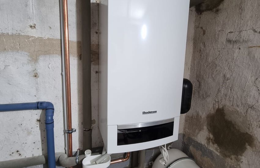 Einbau einer bodenstehenden Gasbrennwertanlage mit nebengestellten Warmwasserbereiter, Fabrikat: Buderus