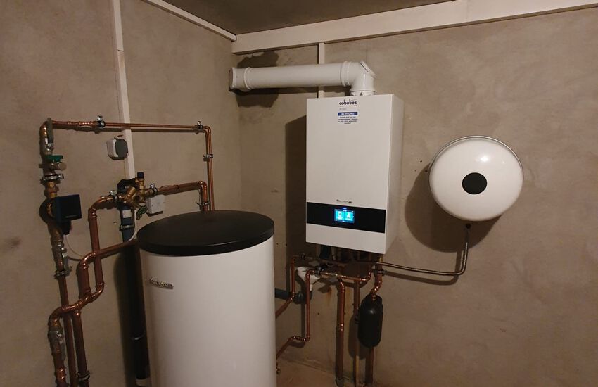 Einbau einer Gasbrennwertanlage mit nebengestellten Warmwasserbereiter, Fabrikat: Buderus