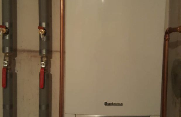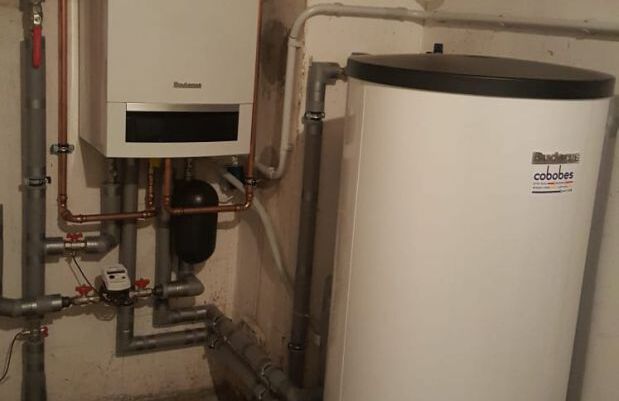 Einbau eines Gasbrennwertgerätes mit nebengestelltem Warmwasserbereiter, Fabrikat: Buderus