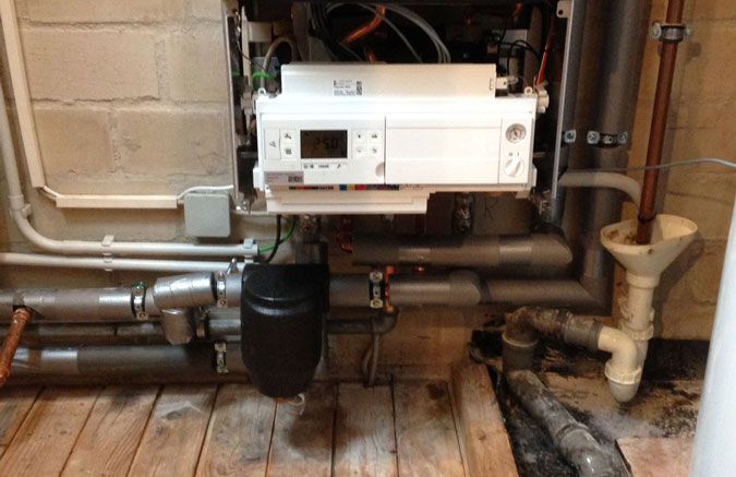 Einbau eines Gasbrennwertgerätes mit nebengestelltem Warmwasserbereiter, Fabrikat: Buderus