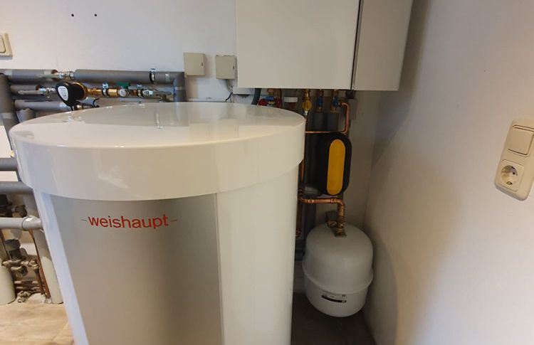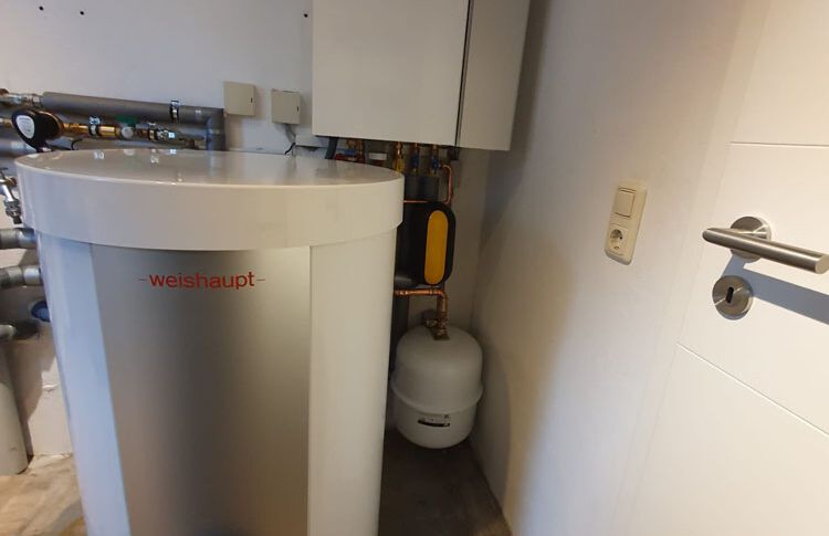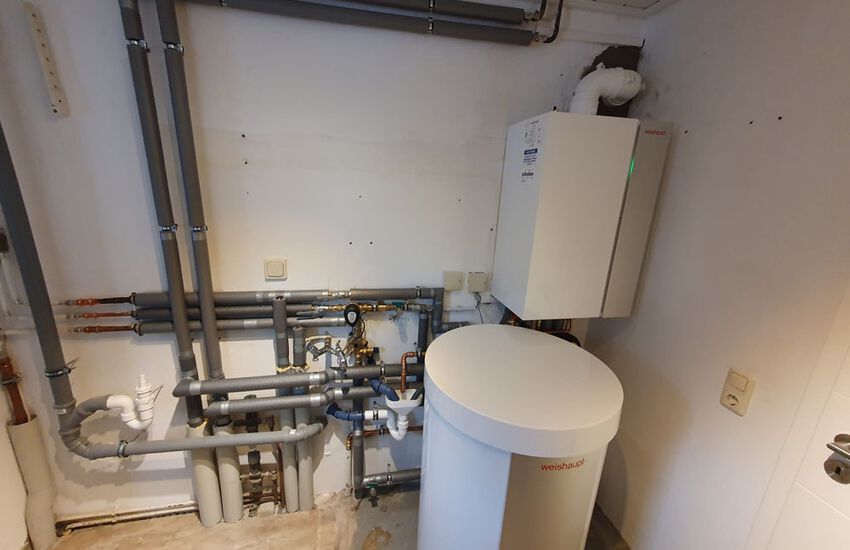 Einbau einer Gasbrennwertanlage mit nebengestellten Warmwasserbereiter, Fabrikat: Weishaupt