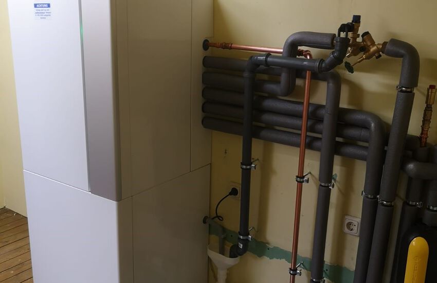 Einbau eines Gasbrennwertgerätes mit untergestellten Warmwasserbereiter, Fabrikat: Weishaupt