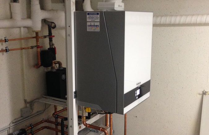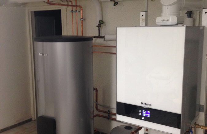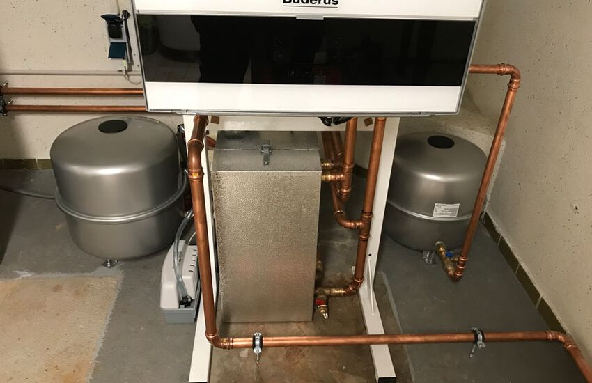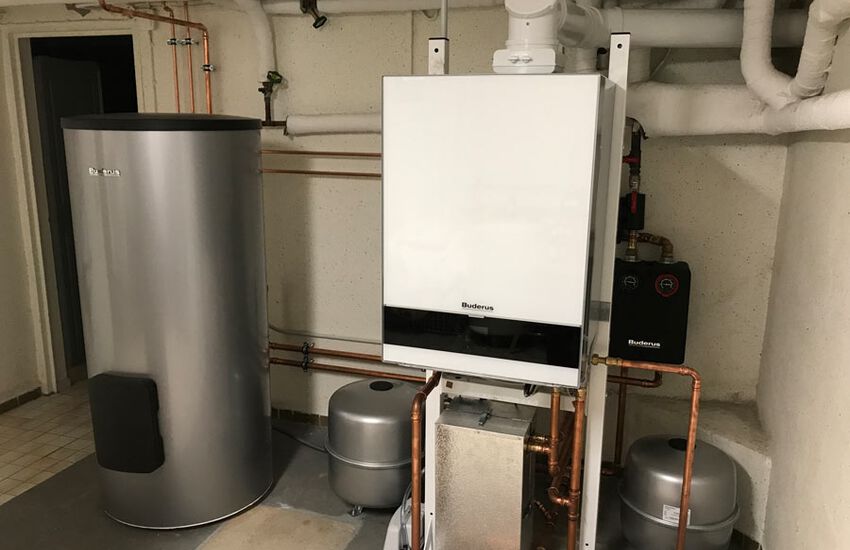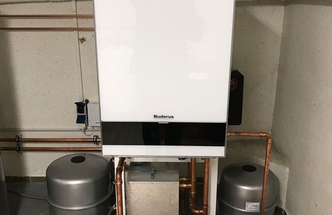 Einbau einer Gasbrennwertanlage mit Warmwasserbereitung, Fabrikat: Buderus mit Glasoptik