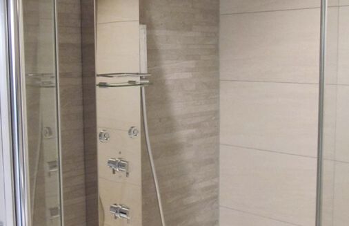 - großzügige Duschanlage mit Sitz und Edelstahl Shower-Paneel
