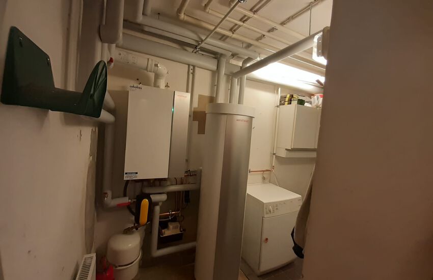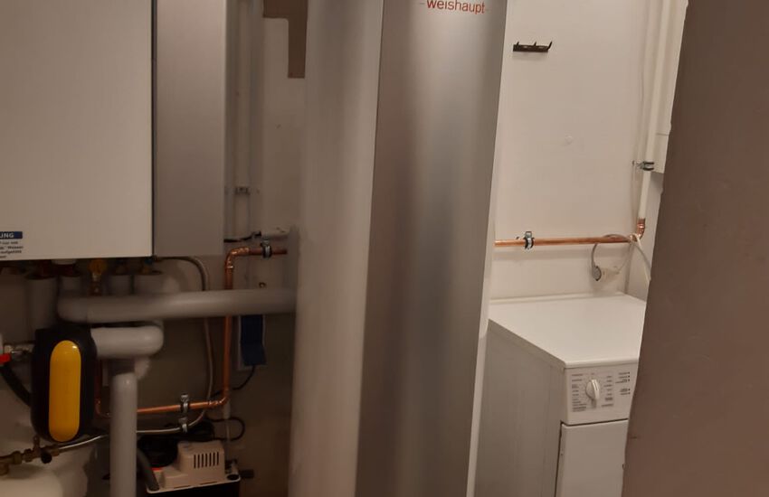 Einbau einer Gasbrennwertanlage mit nebengestellten Warmwasserbereiter, Fabrikat: Weishaupt
