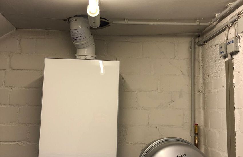 Einbau eines Gasbrennwertgerätes mit nebengestelltem Warmwasserbereiter, Fabrikat: Buderus
