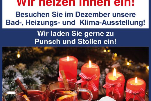 Wir laden Sie gerne für eine Fachberatung für Ihr neues Badezimmer oder Heizung ein und geniessen Sie ab dem 01. Dezember dazu einen heissen Punsch und Weihnachtsgebäck.