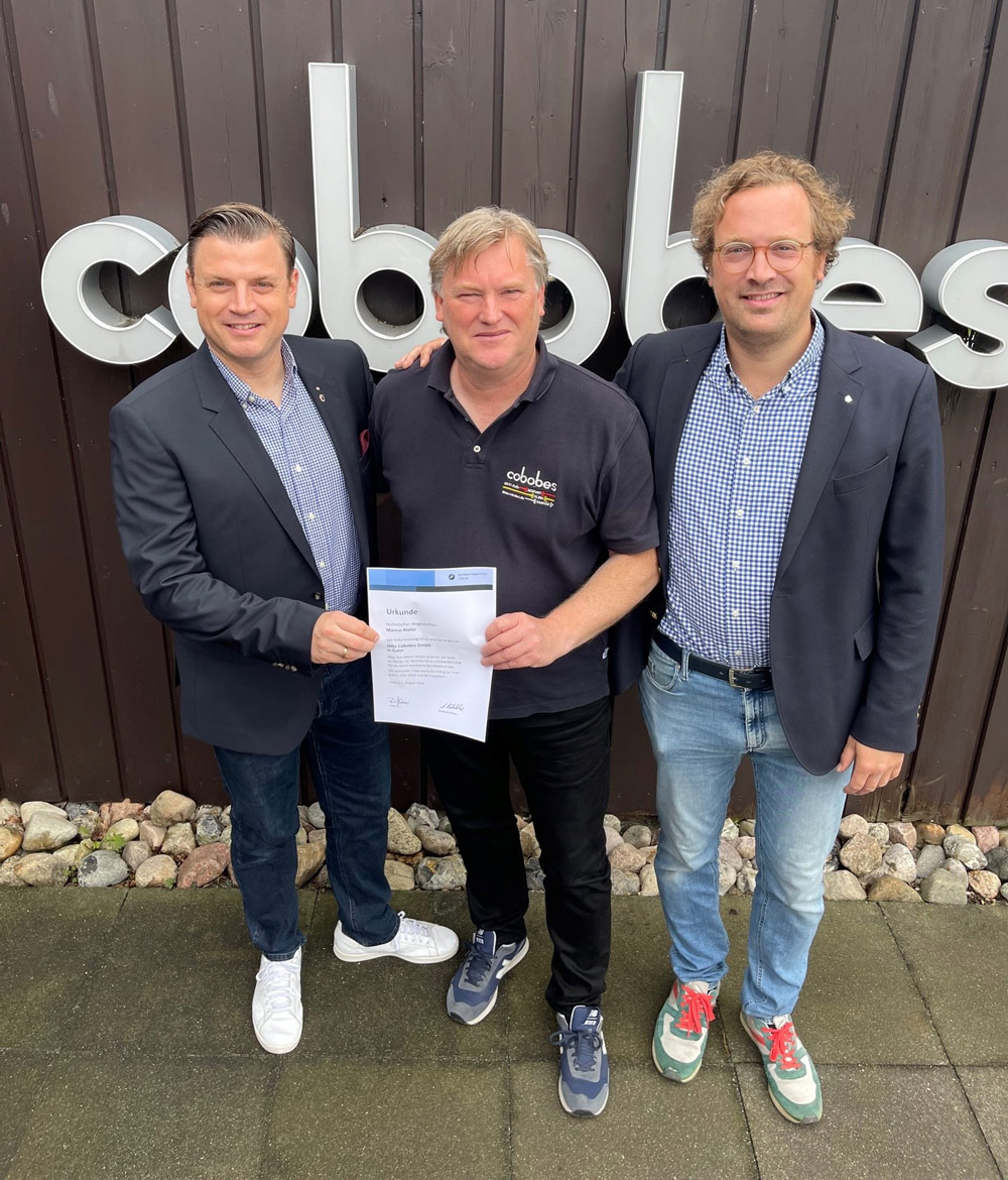 Als Dankeschön wurde Herrn Kiefer neben der Urkunde für langjährige Betriebstreue eine Einmalzahlung vor der Firma Cobobes und ein Gutschein vom Restaurant Exquisites China Restaurant Chau - Eutin übergeben, um den Anlass im Rahmen der Famile gebührend zu feiern.