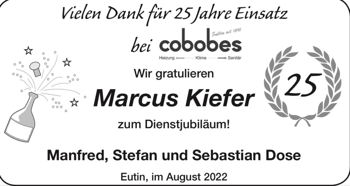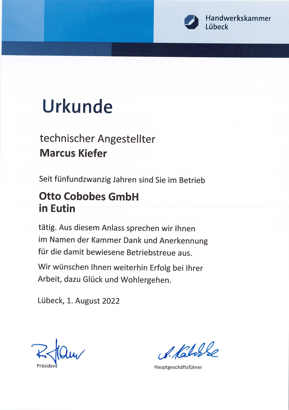 Am 01.08.2022 feierte Kiefer Marcus sein 25 jähriges Jubiläum. Aus diesem Anlass wurden der Jubilar mit einer Urkunde der Handwerkskammer Lübeck ausgezeichnet.