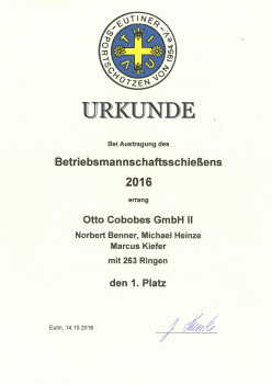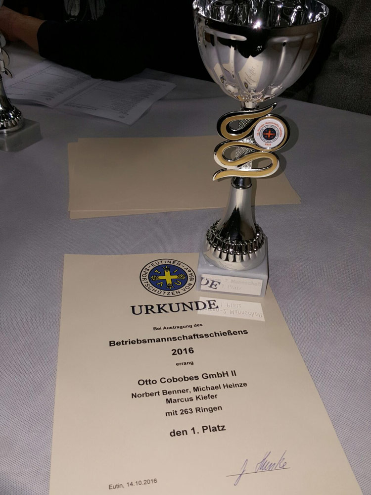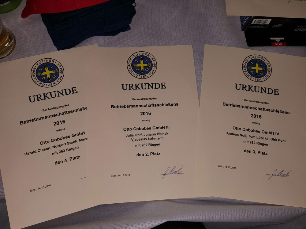 Die Firma Cobobes hat mit 4 Teams zu je 3 Personen an der 58. Auflage des Betriebsmannschaftsschießen der Eutiner Sportschützen teilgenommen. Nach vier Trainingseinheiten und dem Wettkampf am 12.10.2016 wurden die Plätze 1 – 4 in 2 Mannschaftsklassen belegt. Dabei erreichte das Cobobes Team II bestehend aus Norbert Benner, Michael Heinze und Marcus Kiefer mit 263 Ringen den 1. Platz. Auf Platz 2 folgte das Cobobes Team III bestehend aus Julia Ohlf, Johann Blunck und Vjaceslav Lehmann mit 262 Ringen. Den dritten Platz belegte das Cobobes Team IV bestehend aus Andreas Noll, Tom Lübcke und Dirk Pohl. Den vierten Platz belegte Cobobes Team I bestehend aus Harald Clasen, Norbert Stock und Martin Syring. Die Firme Cobobes bedankt sich bei den Eutiner Sportschützen für die gelungene Veranstaltung und freut sich, dass solche Veranstaltungen zur Stärkung des Teamgeistes durchgeführt werden