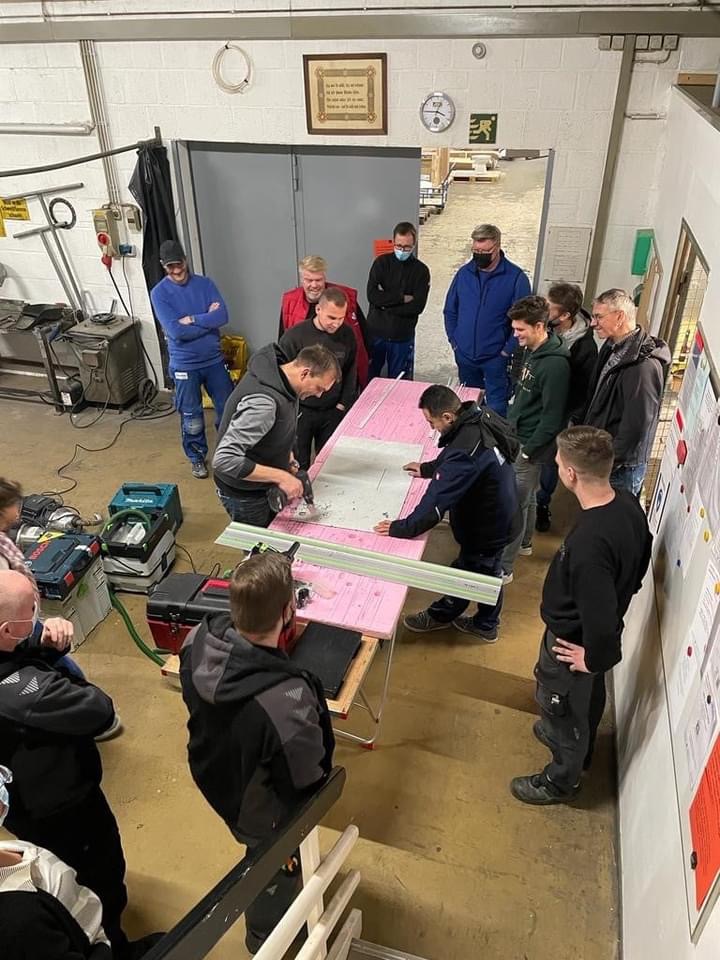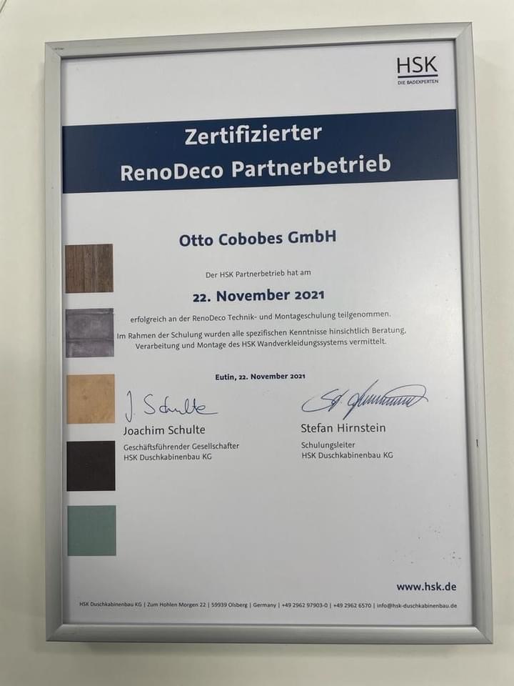 Vor gut zwei Wochen fand bei Cobobes eine HSK Duschkabinenbau Schulung (unter 2G plus) statt, es wurden das Thema RenoDeco (fugenlose Designplatten für den Nassbereich in der Dusche) vermittelt, zunächst in einem Theorieteil (Verarbeitung des Materials, Abdichtung, Pflegehinweise) und dann in einem Praxisteil bestehend aus:
