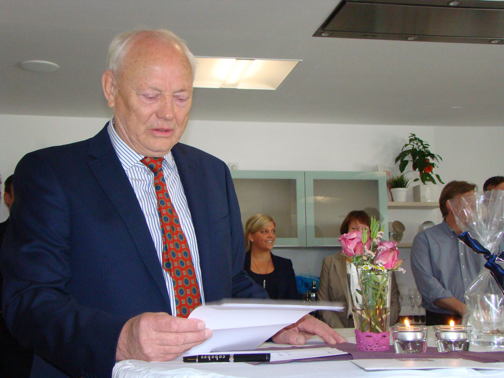 Es folgte als nächster Redner der Landesinnungsobermeister Eckhard Dencker vom Fachverband Sanitär-Heizung-Klima Schleswig-Holstein. Er erwähnte, dass Herrn Manfred Dose neben der Freude an der Arbeit von der Verantwortung für die Firma, die Mitarbeiter und die Familie dominiert wurde. Aber auch im Verband hat Herr Dose Verantwortung übernommen, so gehörte er von 1996 bis 2013 der Tarifkommission an und seine Meinung als Vertreter eines bedeutenden Unternehmens war stets gefragt.