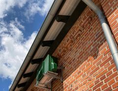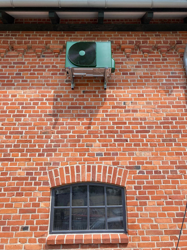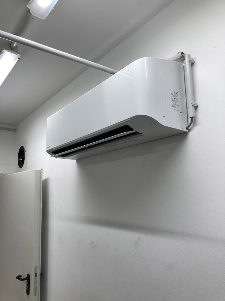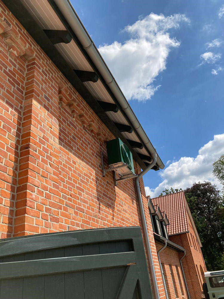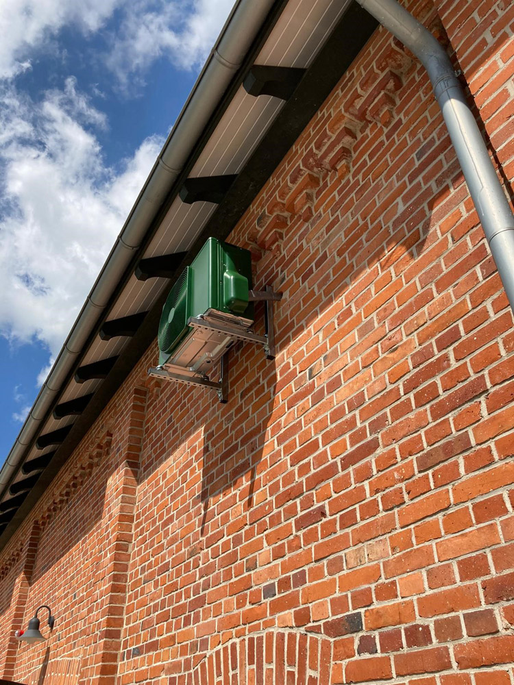 Auf Kundenwunsch können wir das Außengerät der Klimaanlage für den Serverraum auch in TANNENGRÜN passend zu den Stalltoren lackieren.