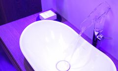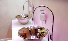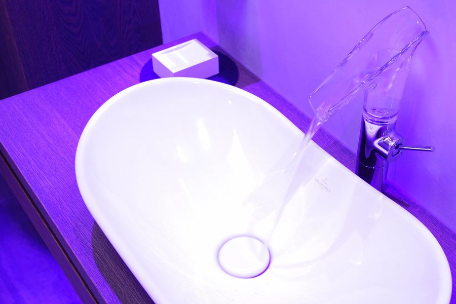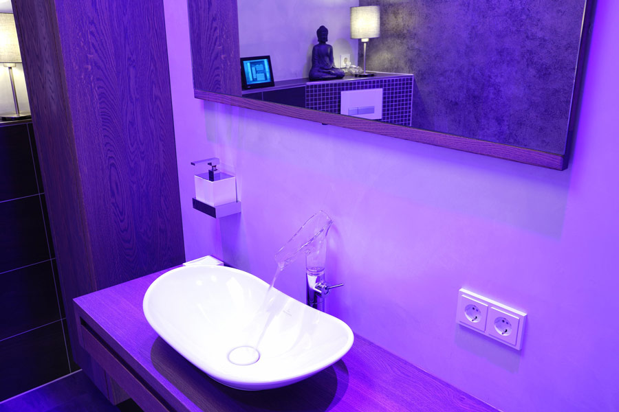 Die Highlights in den beiden Bädern sind die Echtholzmöbel von Floor und Furniture, aber auch die verschromten Gessi Aufsatzwaschbecken aus Keramik, die neue Hansgrohe Armatur mit Glasauslauf mit Tornado Wasserwirbel oder das Geberit-Dusch-WC, welches mit einem Wasserstrahl reinigt. Außerdem wurden die WCs mit Farbbeleuchtung und einem Unterputzradio mit Iphone-Dockingstation ausgerüstet.