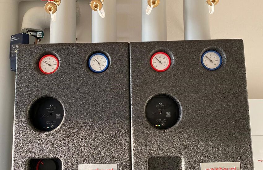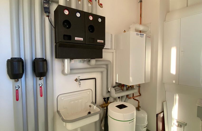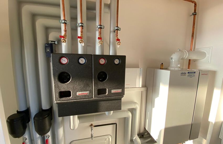 - Einbau einer Gasbrennwerttherme: Weishaupt Kombi-Gerät (WTC-25B) für saisonalen Betrieb