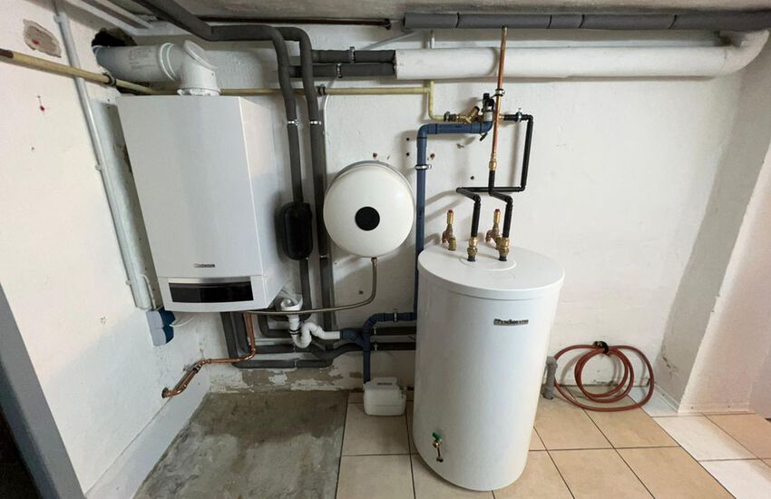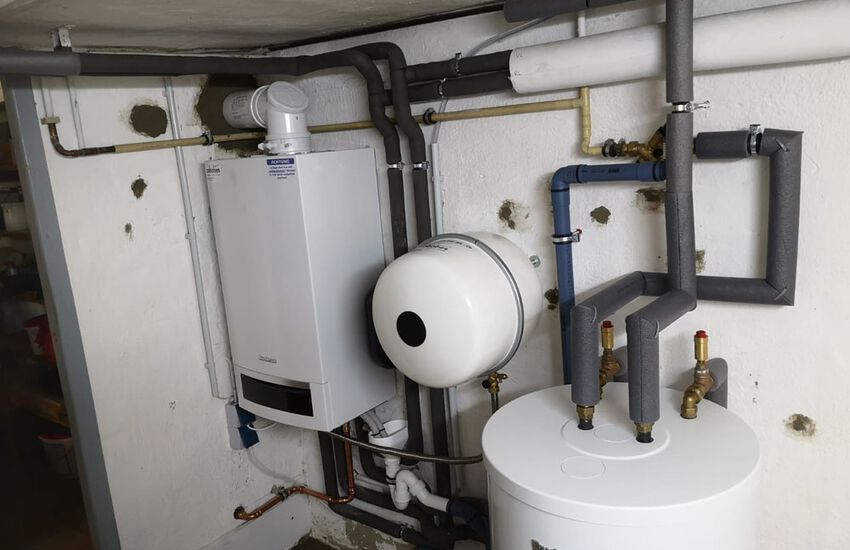 Einbau einer Gasbrennwertanlage mit nebengestellten Warmwasserbereiter, Fabrikat: Buderus