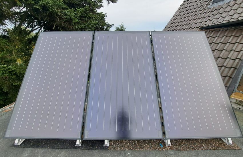Einbau einer bodenstehenden Gasbrennwertanlage mit nebengestellten Warmwasserbereiter mit Solar für Warmwasserbereitung auf dem Flachdach, Fabrikat: Buderus