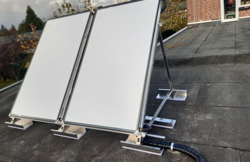 Einbau einer bodenstehenden Gasbrennwertanlage mit nebengestellten Warmwasserbereiter mit Solar für Warmwasserbereitung auf dem Flachdach, Fabrikat: Weishaupt