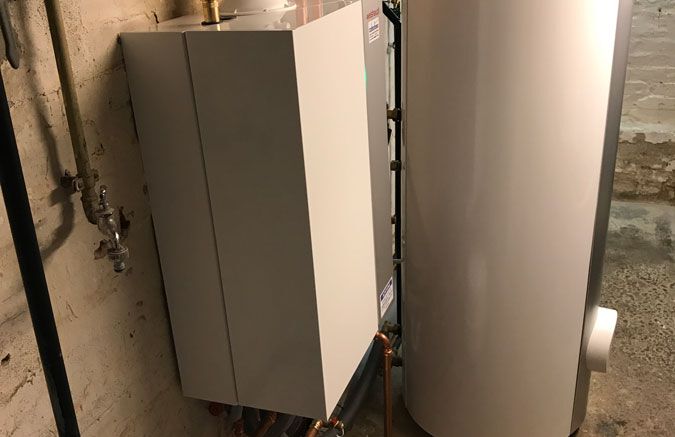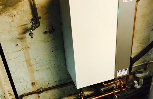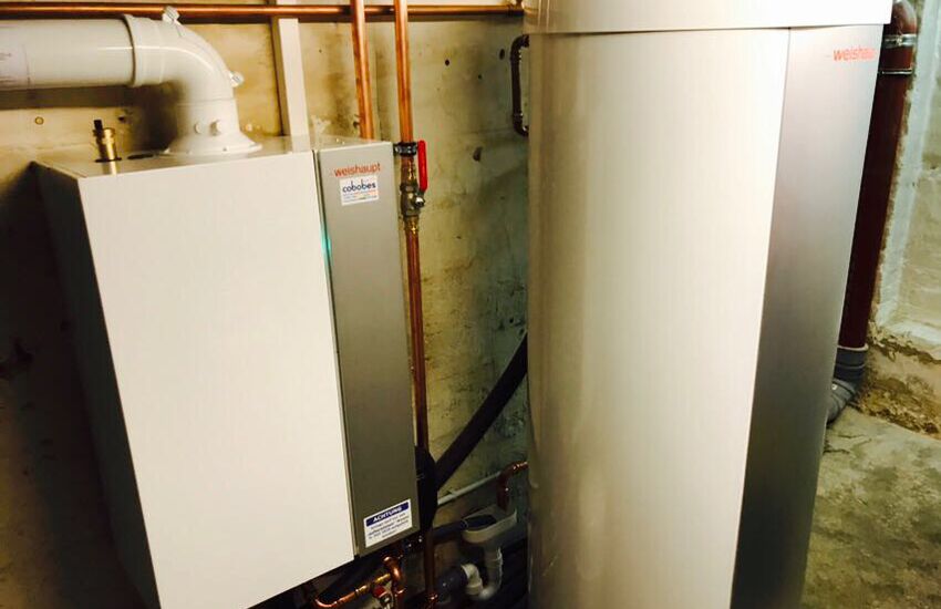 Einbau eines Gasbrennwertgerätes mit nebengestelltem Warmwasserbereiter, Fabrikat Weishaupt